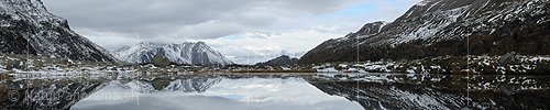 P015256b: Panoramabild Spiegelung einer leicht verschneiten Berglandschaft