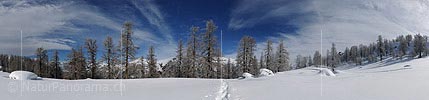 P007226c: Panoramafoto Frisch verschneiter Lärchenwald