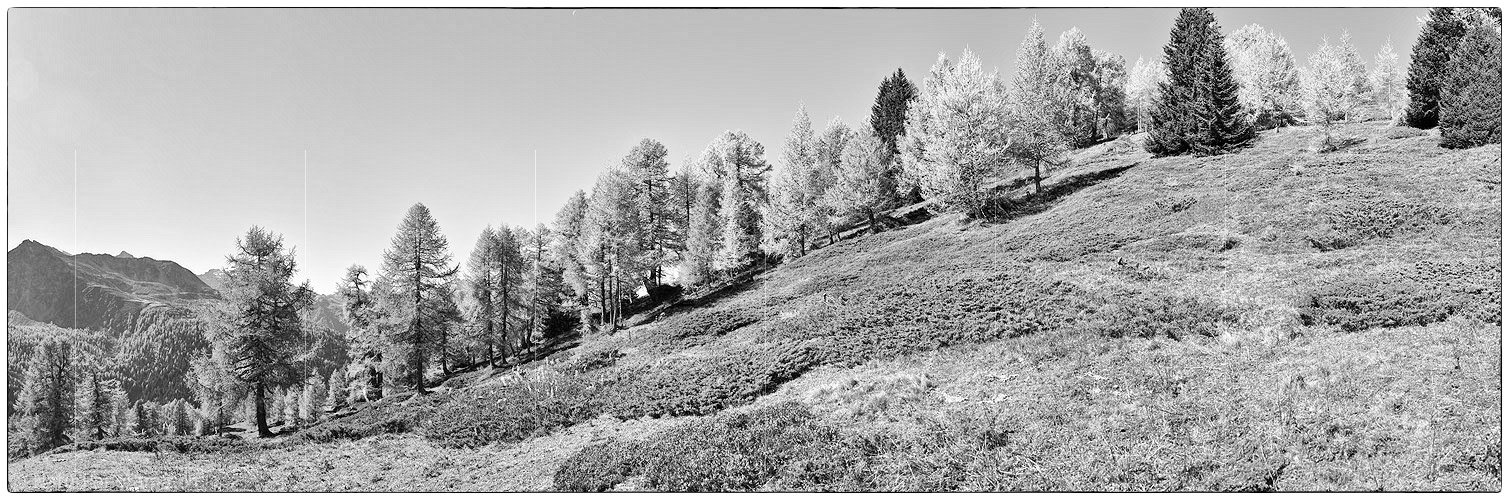 Auf dieser Seiten wird das Panoramafoto P020686 (Panoramafoto Reihe herbstlich gefärbter Lärchen) in ein paar Schwarz/Weiss-Varianten gezeigt.